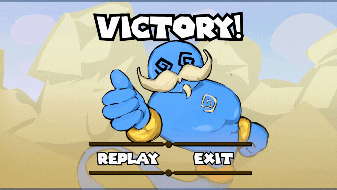 The most immediately notable UI is the collection of assets towards the bottom of the screen. It stays out of the way of the playing field, and it communicates the most vital information. Because of how fast each match moves, players and team members weren’t fully focused on how much sand their side was filled with. All of their focus was on hitting pillars and engaging with the input mini-game. Each player has a bar that representing their colors and the amount of sand their side is filled with. Between the bars is a hourglass that quickly communicates which direction the arena is tilting. It all comes back to communication, having an easy to read piece of UI that allows the player understand what’s going on at a glance.